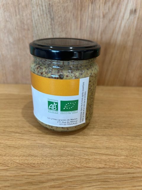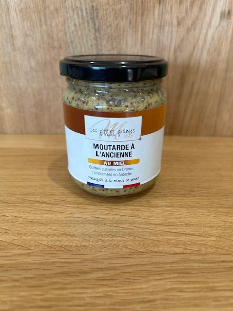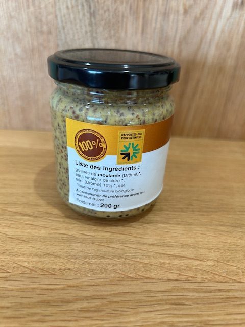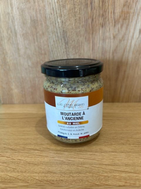 Pot de 200 g de moutarde à l’ancienne au miel cultivée dans la Drôme et transformée en Ardèche.